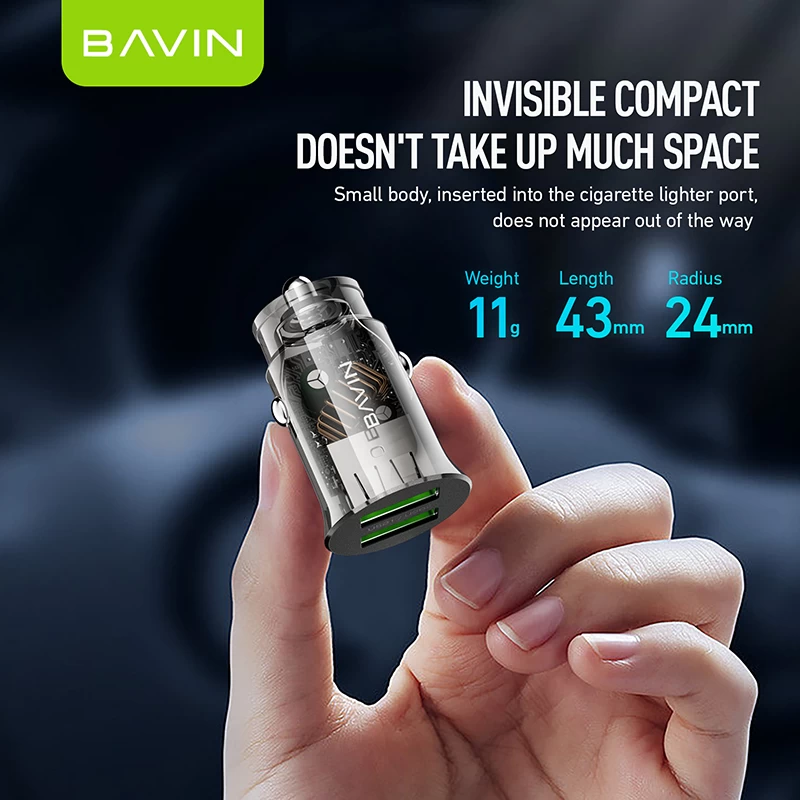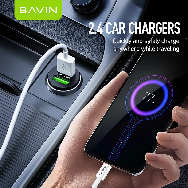 Bavin auto punjač 2.4A Dual 2xUSB-A + kabl type-A na type-C crna