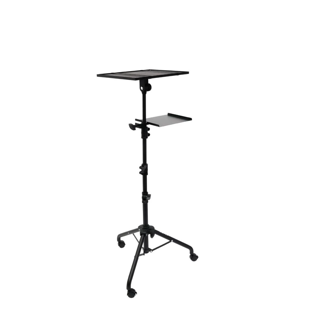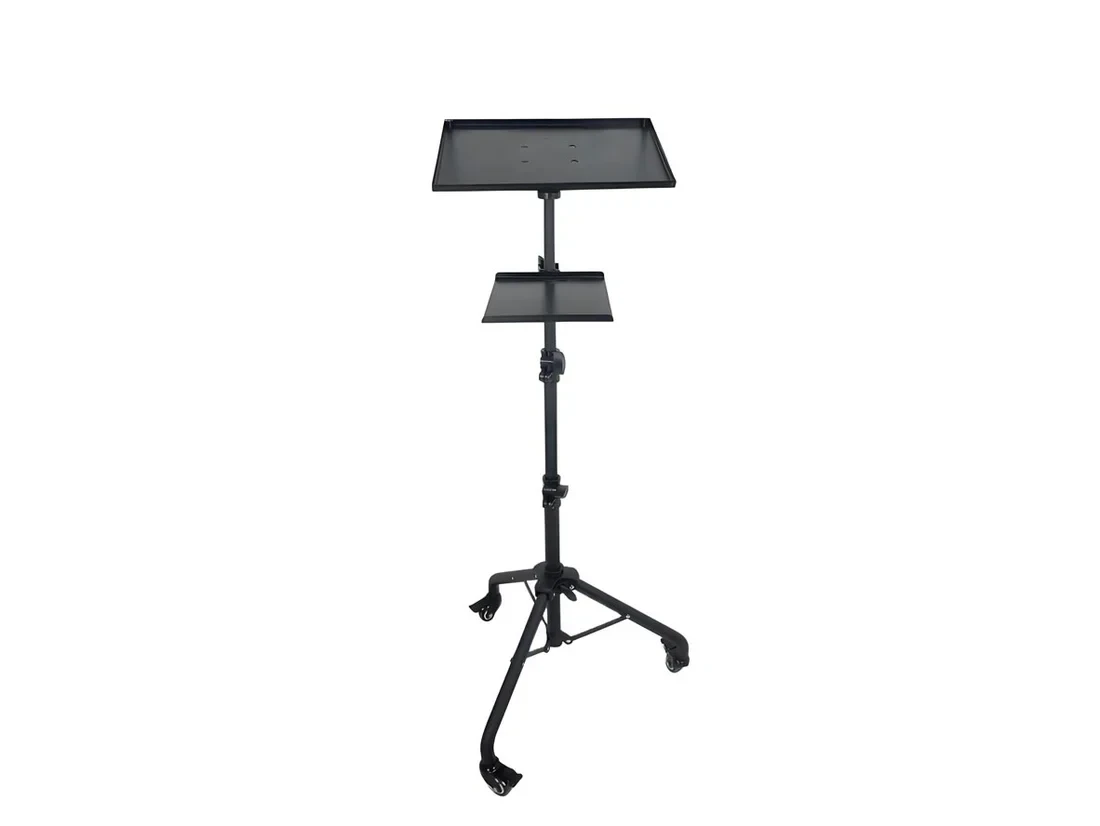 Visina 0.66-1.30m Prečnik cevi 30/25/22/19mm (teleskop) Gornja platforma 38.5x28.5 cm nosivost 10kg Srednja platforma 25x20cm nosivost 5kg ili 2.5 kg po drugom izvoru Materijal Metal + ABS plastika Rotacija 180 gornje ploče ,teleskop podesiv, točkić sa blokadom Prednosti: Veoma prenosivo i stabilno zahvaljujući točkićima sa blokadom – idealno za prezentacije, projekcije ili kampovanje. Veliki prostor za projektor i prateću opremu, pogodan za audio/video biznis setup.